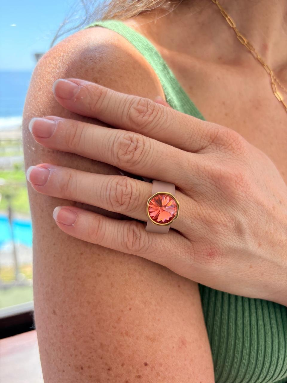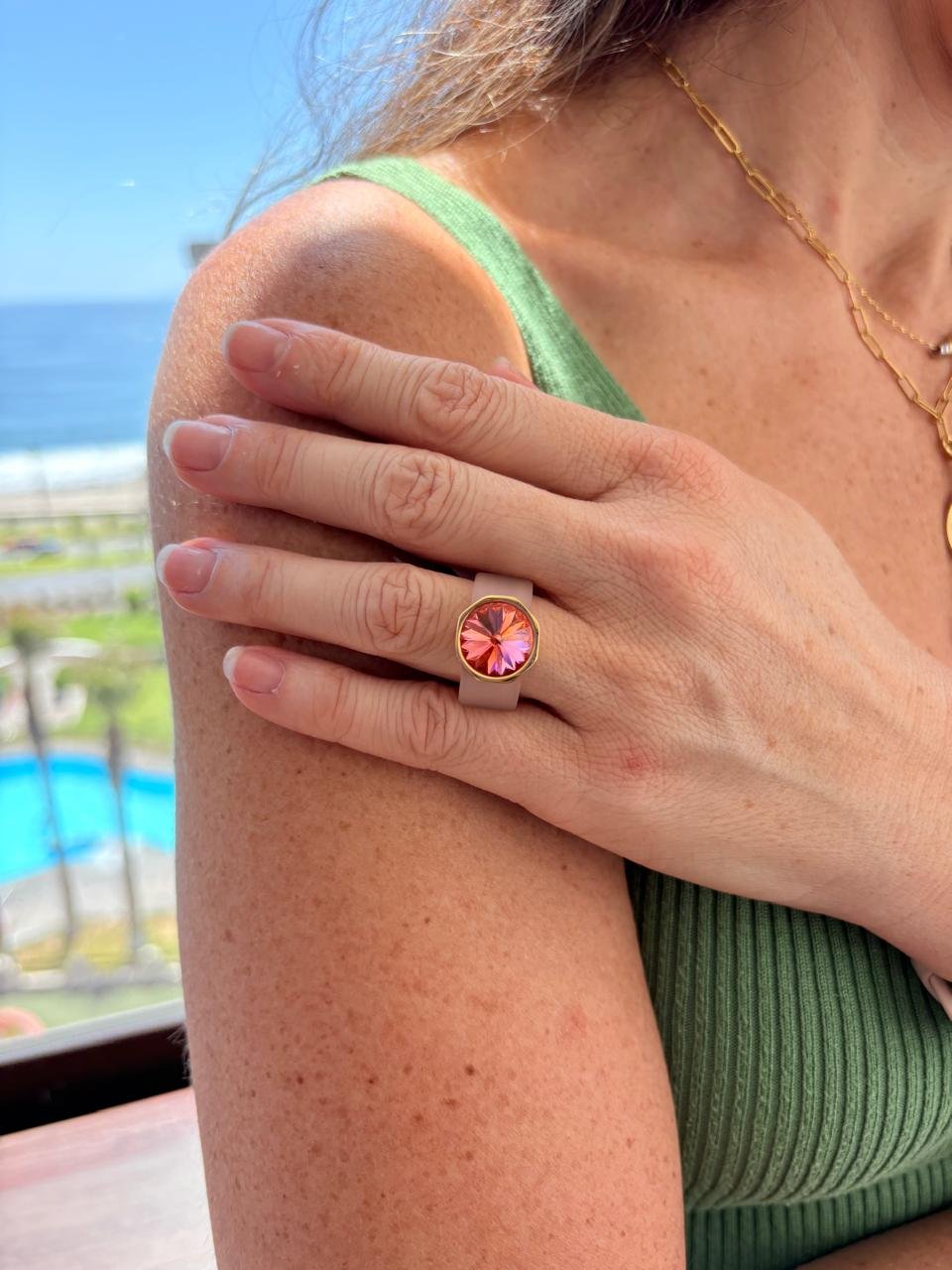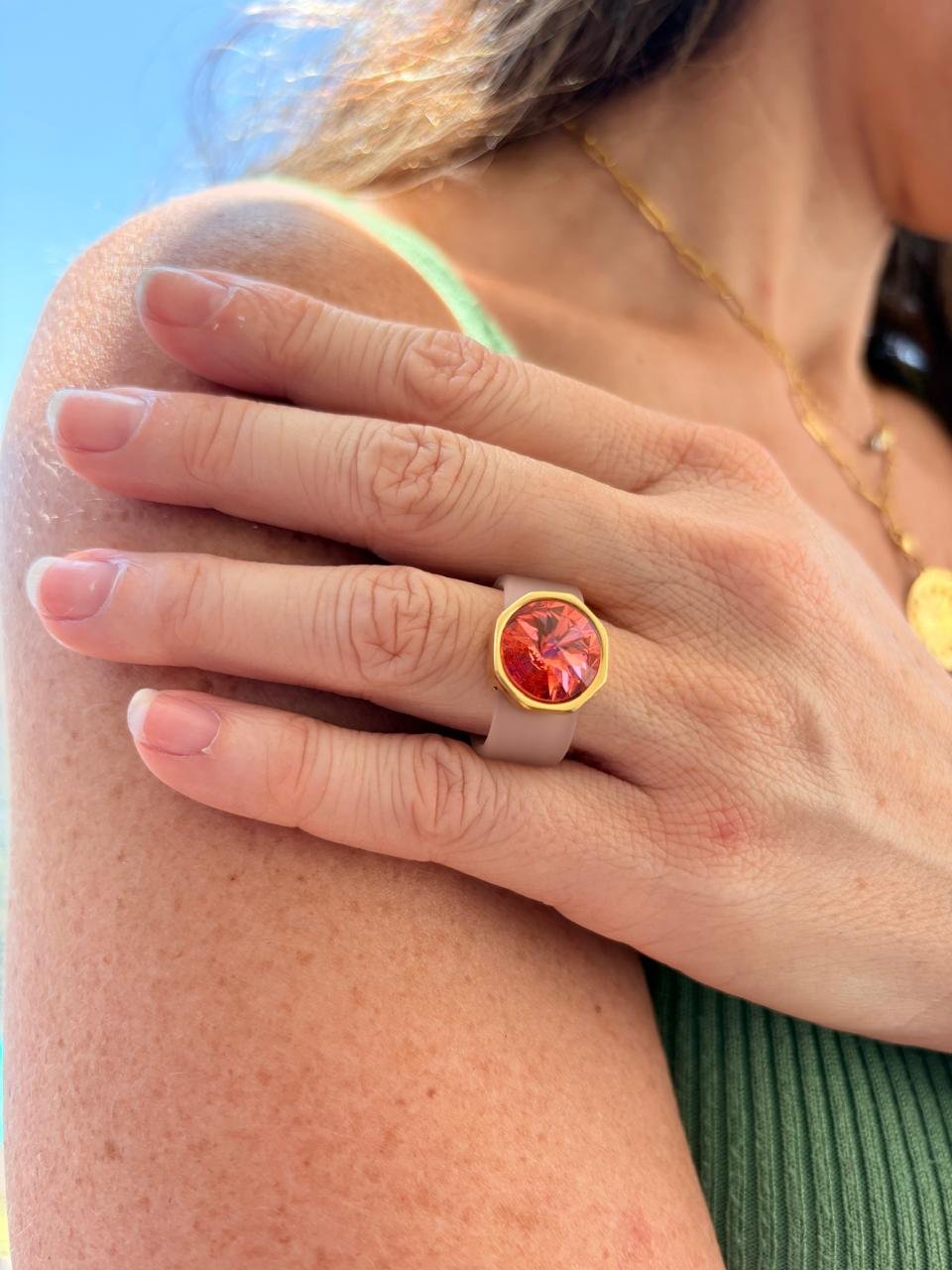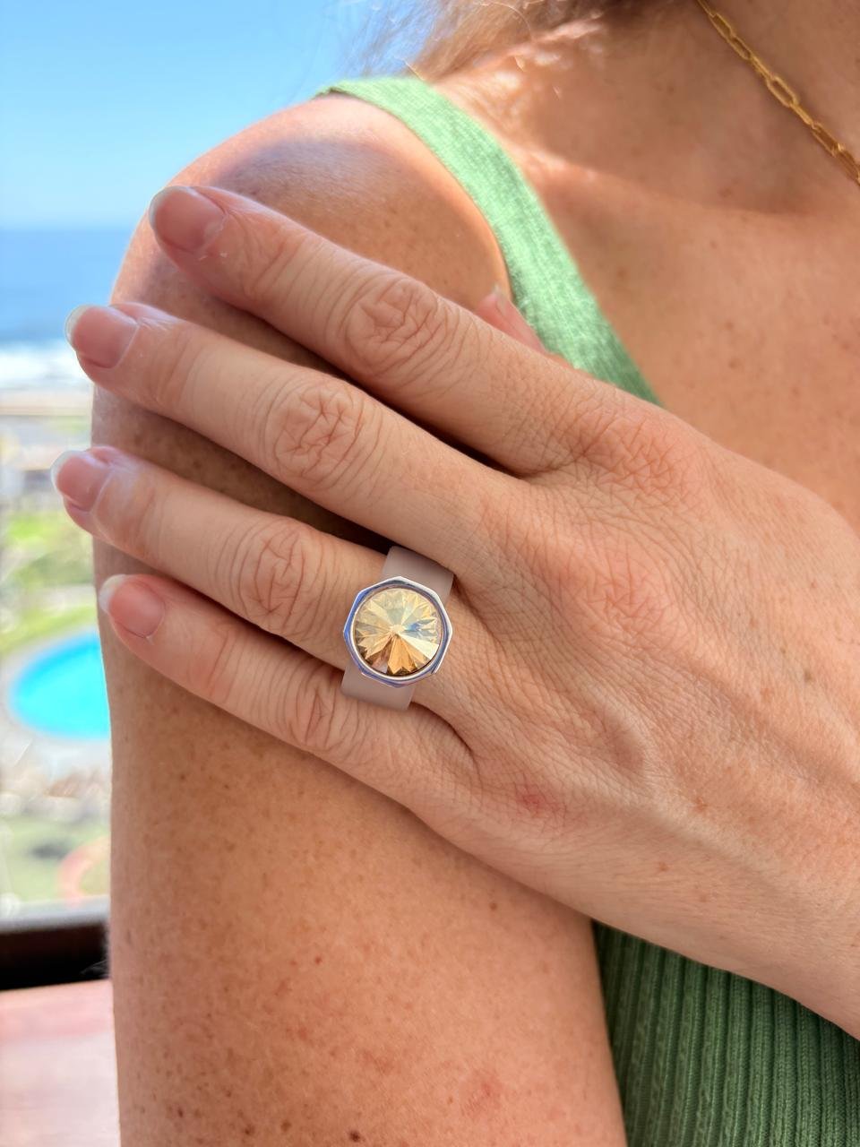Anillo Octágono de caucho con cristal austriaco. Un diseño exclusivo, femenino y sofisticado que combina comodidad, ligereza y brillo para un look casual con estilo.