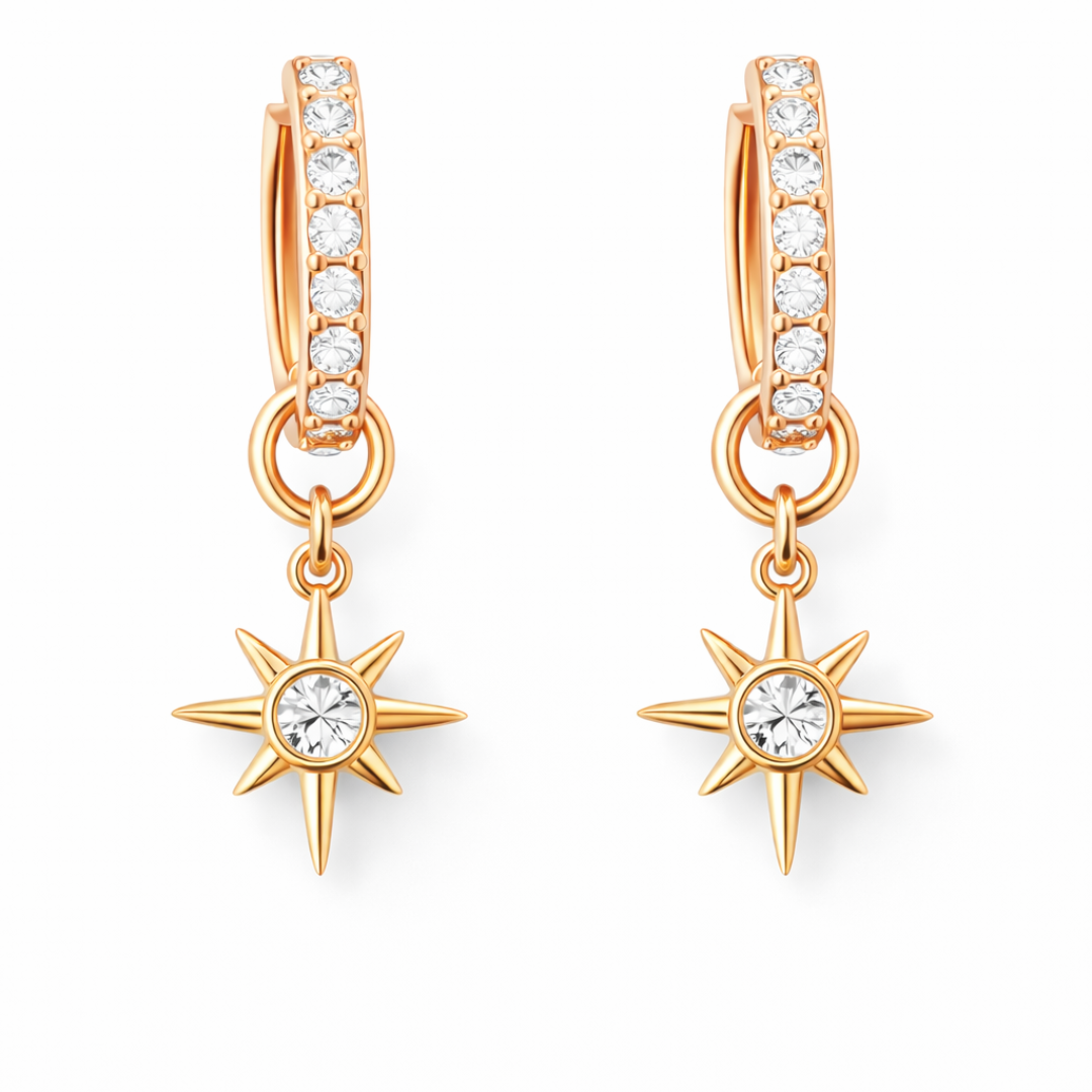 Argollas con cristal austriaco genuino y charm estrella de brújula, bañadas en oro rosa. Diseño simbólico, versátil e hipoalergénico.