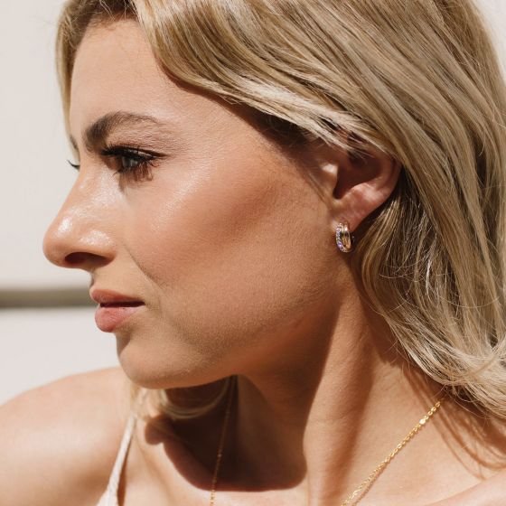 Argollas Trinity Brilliance con cristales austriacos pavé y triple baño en oro, rodio y oro rosa. Elegantes, luminosas y hipoalergénicas. Un diseño que equilibra lo clásico, moderno y femenino.