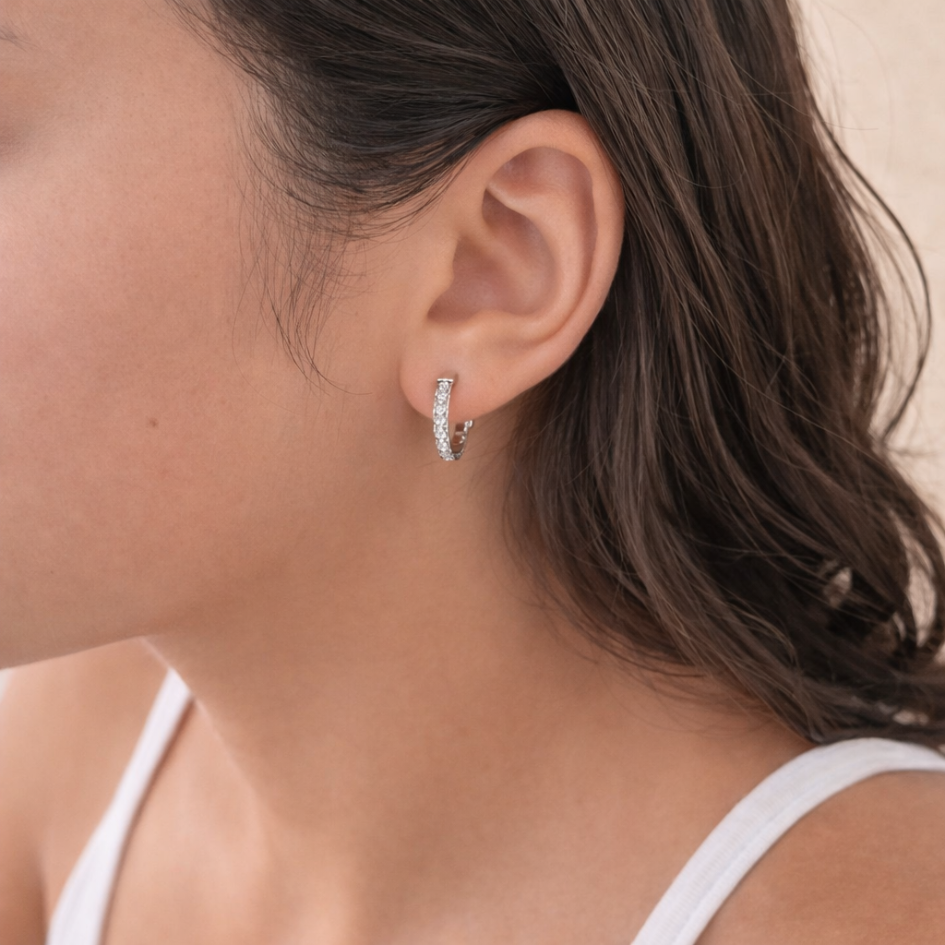 Argollas Eternity de 14 mm con cristales de Austria baño en oro, oro rosa o rodio. Atemporales, luminosas y versátiles, ideales para usar de día o de noche.