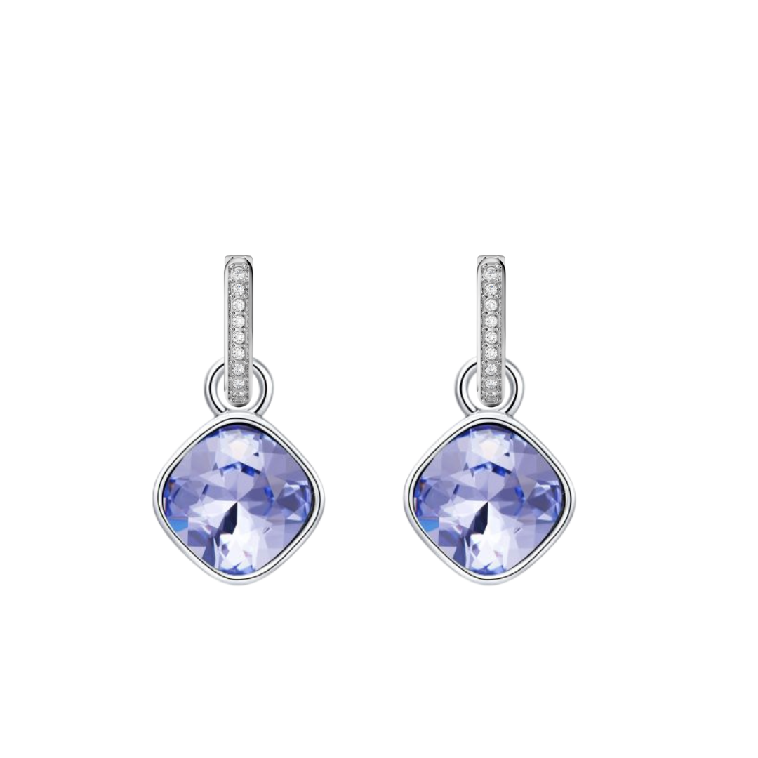 Argollas Eternity de 12 mm con charms Mix en forma de cojín y cristal Swarovski color lavanda. Bañadas en rodio, hipoalergénicas y perfectas para elevar cualquier look con elegancia.