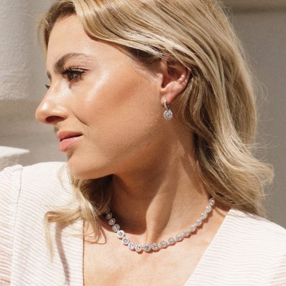 Los aros colgantes Angelic Circle cristal rodio son 100 % hipoalergénicos y libres de níquel y plomo, lo que los hace seguros incluso para pieles sensibles. Finalmente, este set se entrega en una elegante caja Bloom, ideal para regalar o para sumar a tu colección personal de joyas.