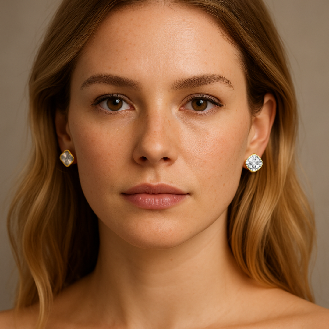 Cada aro incorpora cristales transparentes de alto brillo, engastados en un diseño tipo cushion que refleja la luz desde todos los ángulos, aportando luminosidad sin excesos. El baño de oro de alta calidad realza el acabado, entregando una sensación cálida y refinada que eleva cualquier look.
