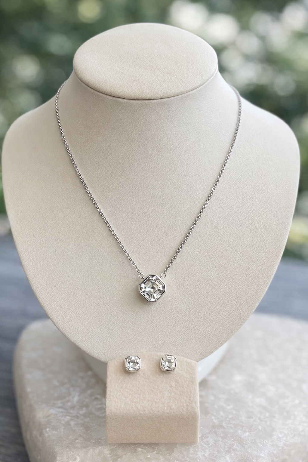 Collar Asscher con cristal austriaco transparente y baño en rodio. Un diseño exclusivo, femenino y sofisticado que aporta brillo geométrico y elegancia atemporal.