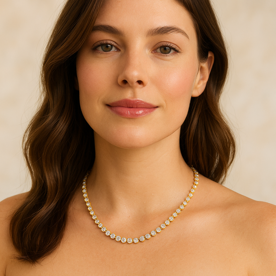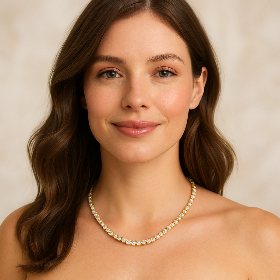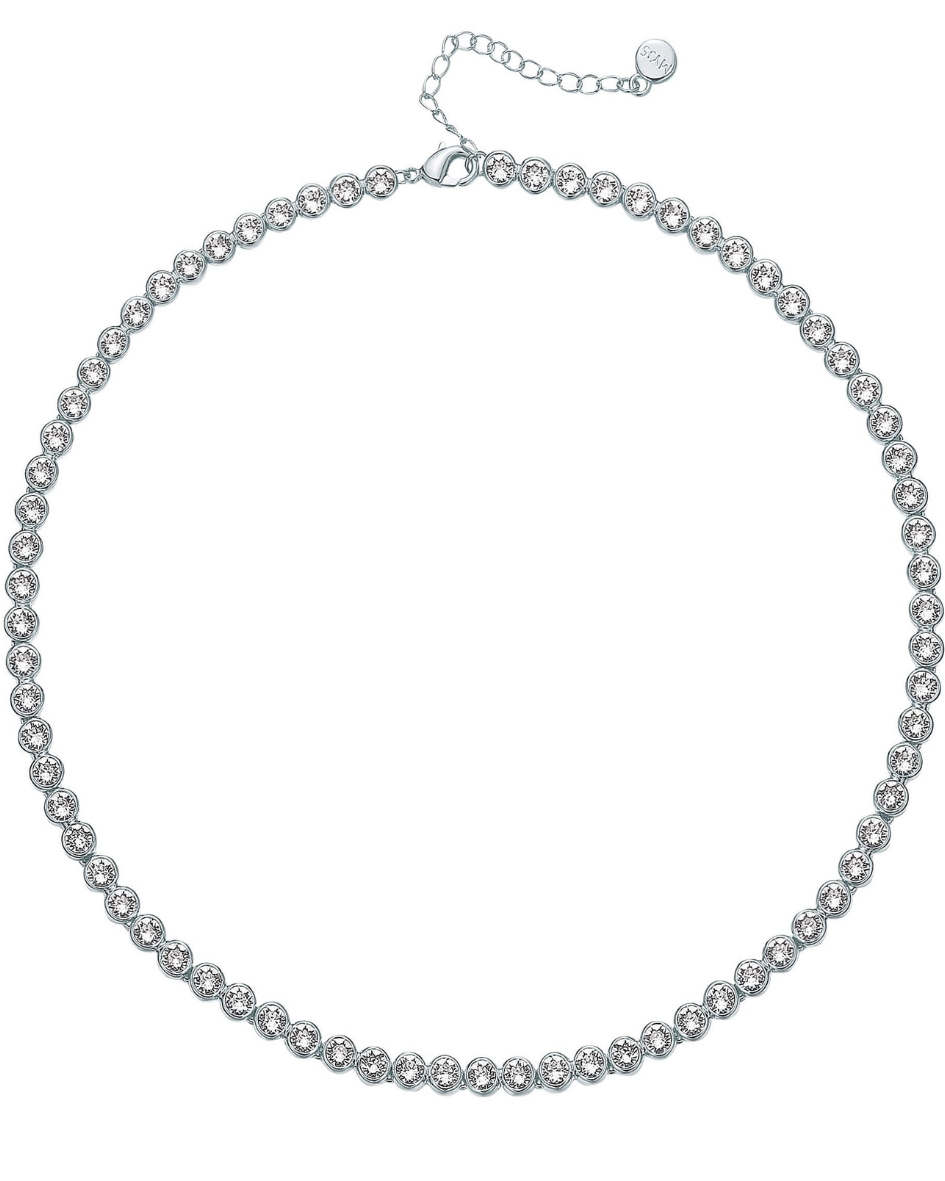 Su hilera uniforme de cristales austriacos transparentes destaca por su pureza y luminosidad, reflejando la luz de forma delicada y envolvente. Disponible en baño de oro de 16 quilates para un acabado cálido y glamoroso, o en baño de rodio para un look moderno y pulido, este collar se adapta fácilmente a distintos estilos y ocasiones.