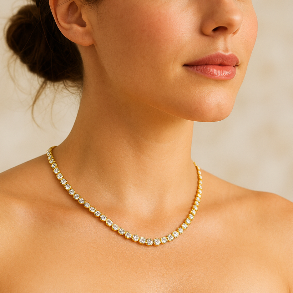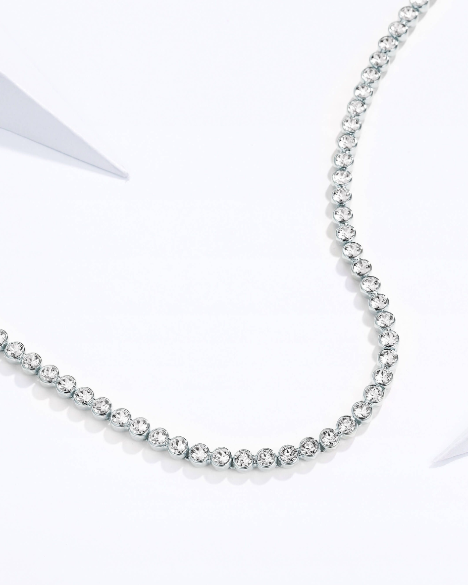 El collar de tenis con cristales austriacos es un clásico imprescindible de la joyería femenina, reconocido por su brillo continuo y su estilo exclusivo, femenino y sofisticado. Su diseño elegante realza cualquier look con una luminosidad refinada y atemporal.