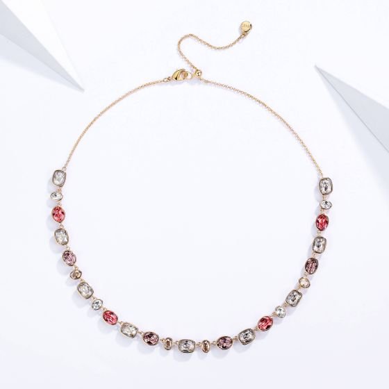Este collar incorpora cristales austriacos en tonos rosados, cuidadosamente engastados para reflejar la luz con sutileza y brillo equilibrado. El baño en oro de 16k aporta un acabado cálido y refinado que realza el color de los cristales y eleva el diseño a un nivel elegante y atemporal. Su cadena ajustable hasta 45 cm permite adaptarlo fácilmente a distintos escotes y estilos.