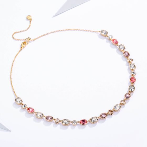 Collar Festival Rose con cristales austriacos en tonos rosados y baño en oro de 16k. Un diseño exclusivo, femenino y sofisticado que ilumina tu look con dulzura y elegancia.