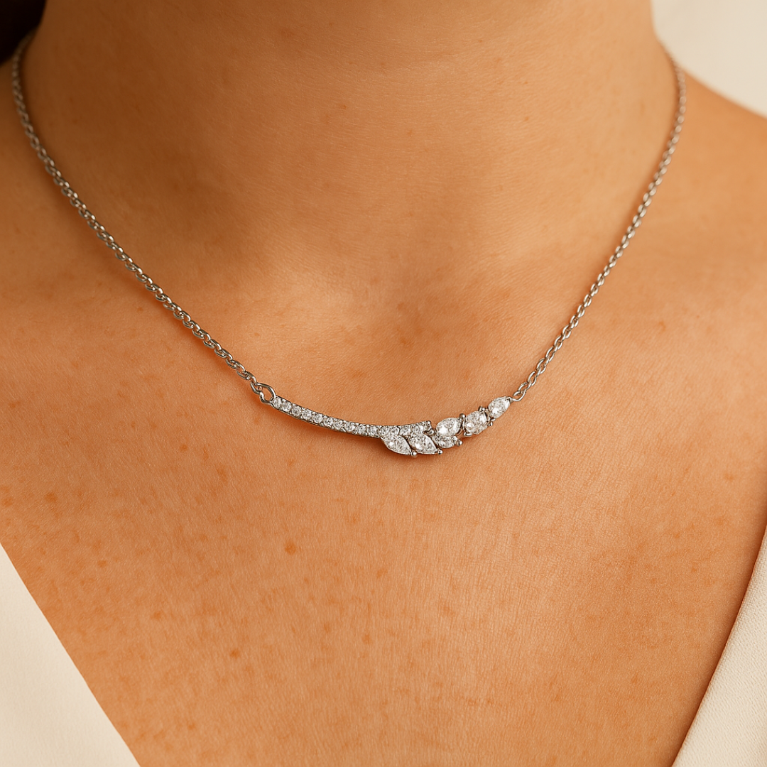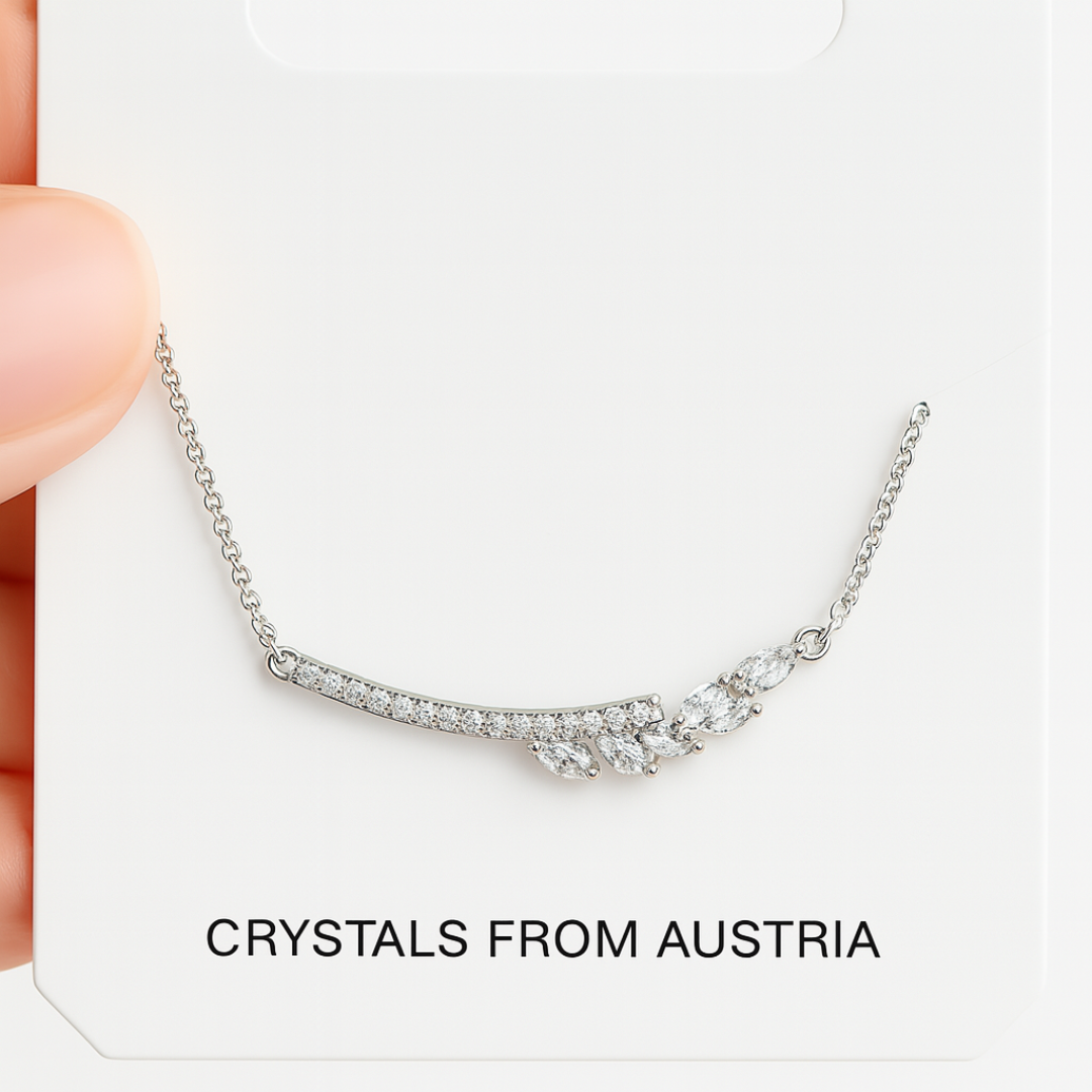 El collar presenta una composición de cristales de Austria de corte marquesa, dispuestos de manera delicada sobre un microengaste que refleja la luz con sutileza y brillo equilibrado. El baño en rodio aporta un acabado luminoso, moderno y duradero, ideal para realzar el diseño y aportar sofisticación atemporal. Su largo de 44 cm y cierre deslizable permiten un ajuste cómodo y versátil.
