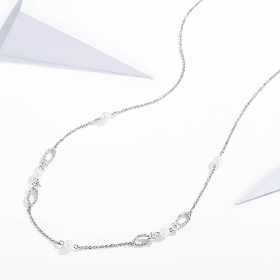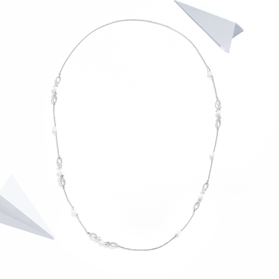 Collar Largo de Perlas Blancas y Cristales en Rodio