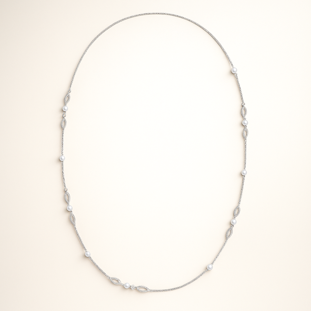 Collar largo de perlas blancas y cristales en rodio. Diseño exclusivo, femenino y sofisticado, ideal para looks elegantes o regalo especial ✨