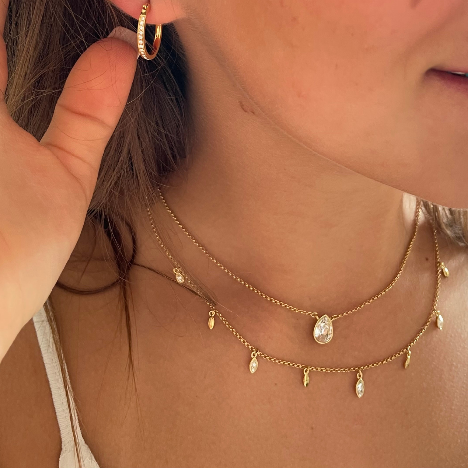 Collar Teardrop con cristal austriaco transparente y baño en oro. Un diseño exclusivo, femenino y sofisticado que ilumina tu estilo con elegancia atemporal.