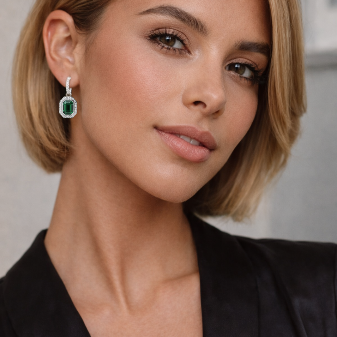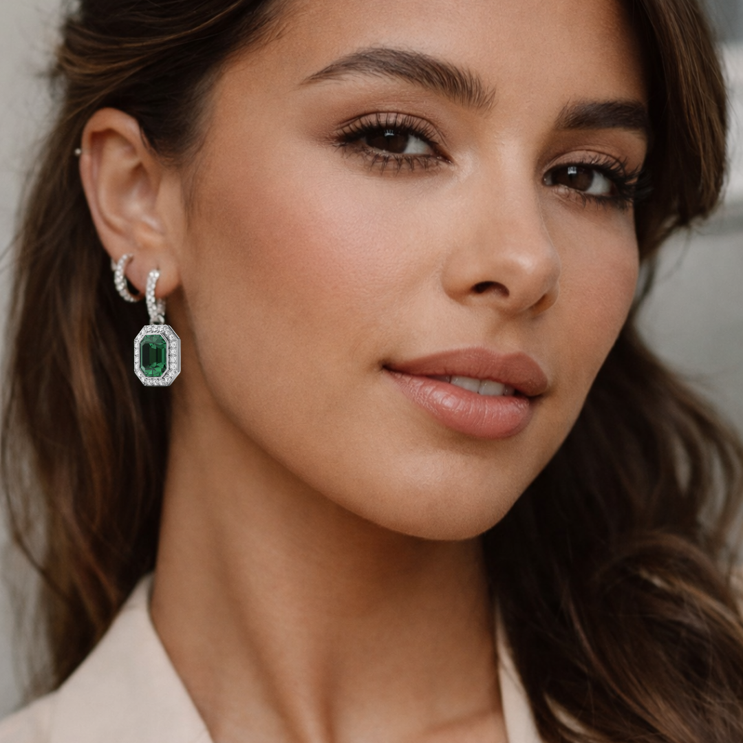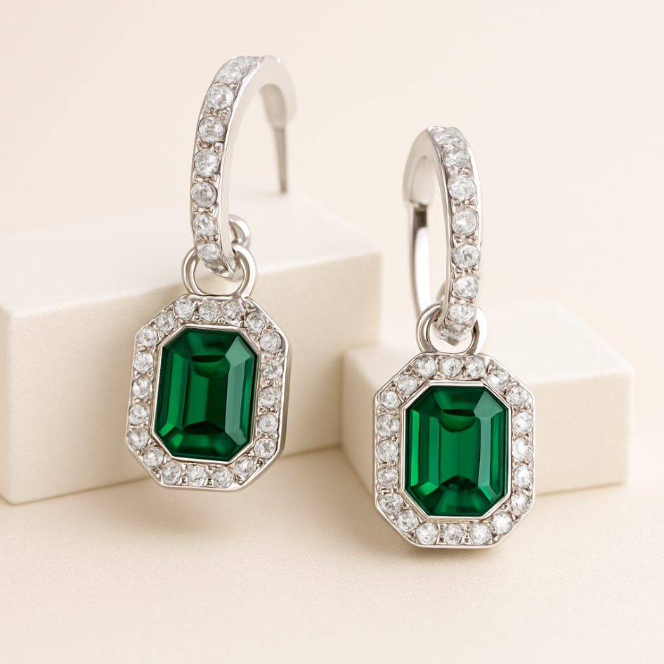 Además, este conjunto incluye los Charms Octágono Halo, engastados con cristales de Austria en tono esmeralda, cuyo diseño geométrico captura la luz desde todos los ángulos, aportando un efecto visual elegante y moderno. Por otra parte, el acabado en rodio entrega un look fresco, atemporal y altamente combinable.