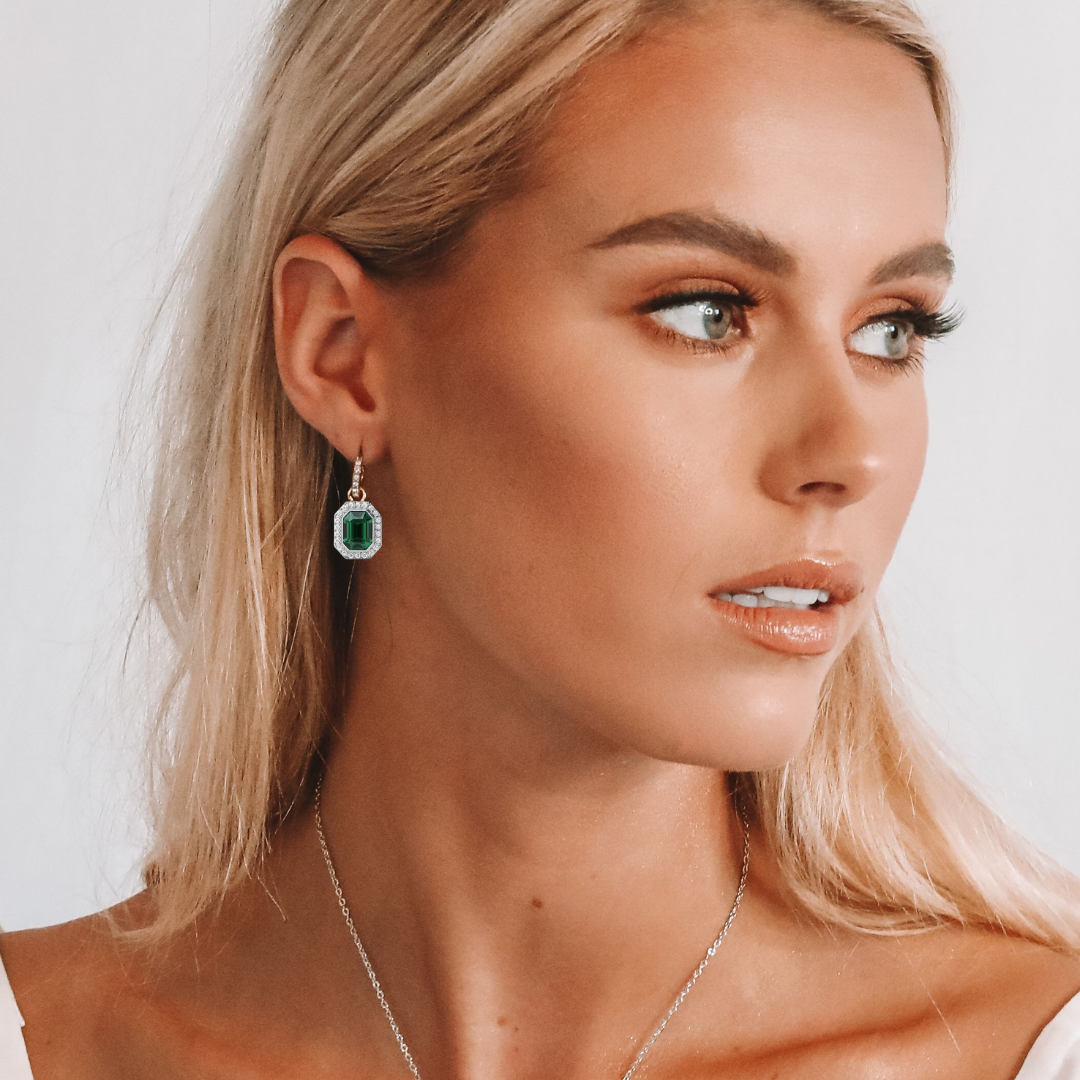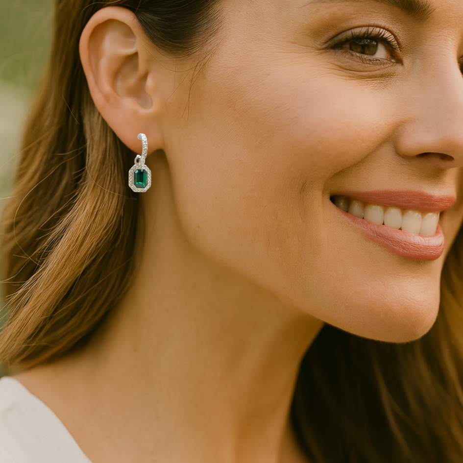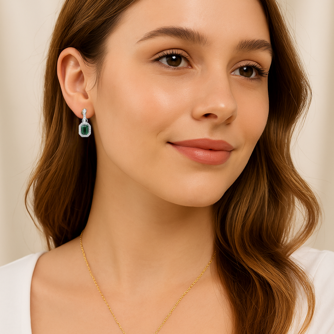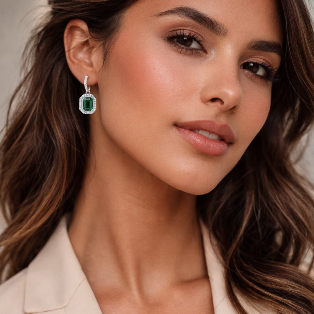 Además, este conjunto incluye los Charms Octágono Halo, engastados con cristales de Austria en tono esmeralda, cuyo diseño geométrico captura la luz desde todos los ángulos, aportando un efecto visual elegante y moderno. Por otra parte, el acabado en rodio entrega un look fresco, atemporal y altamente combinable.