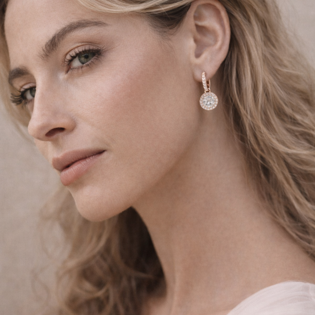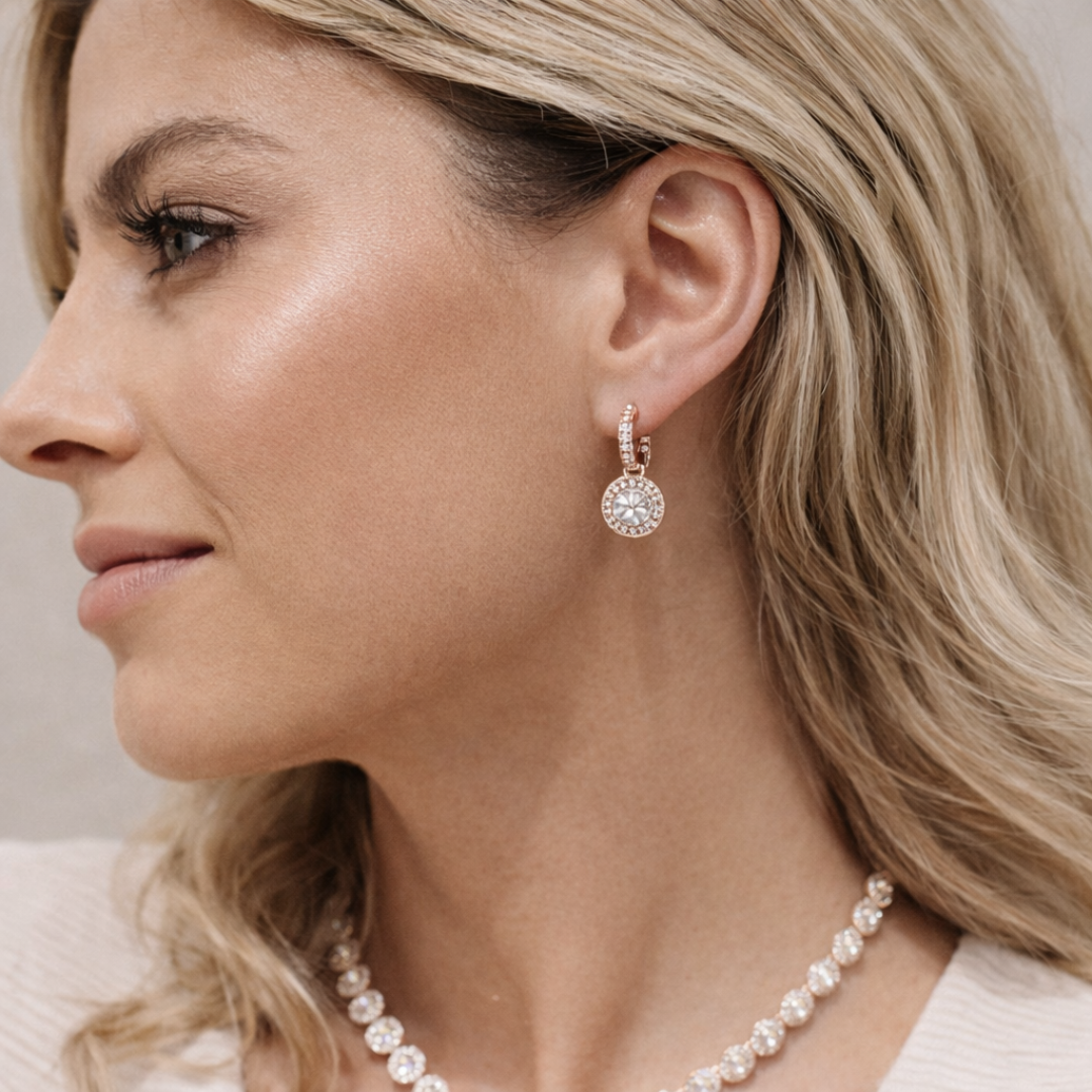 Pendientes angelicales con cristales transparentes y baño en oro rosa. Diseño elegante y versátil con argollas y charms intercambiables. Hipoalergénicos y libres de níquel.