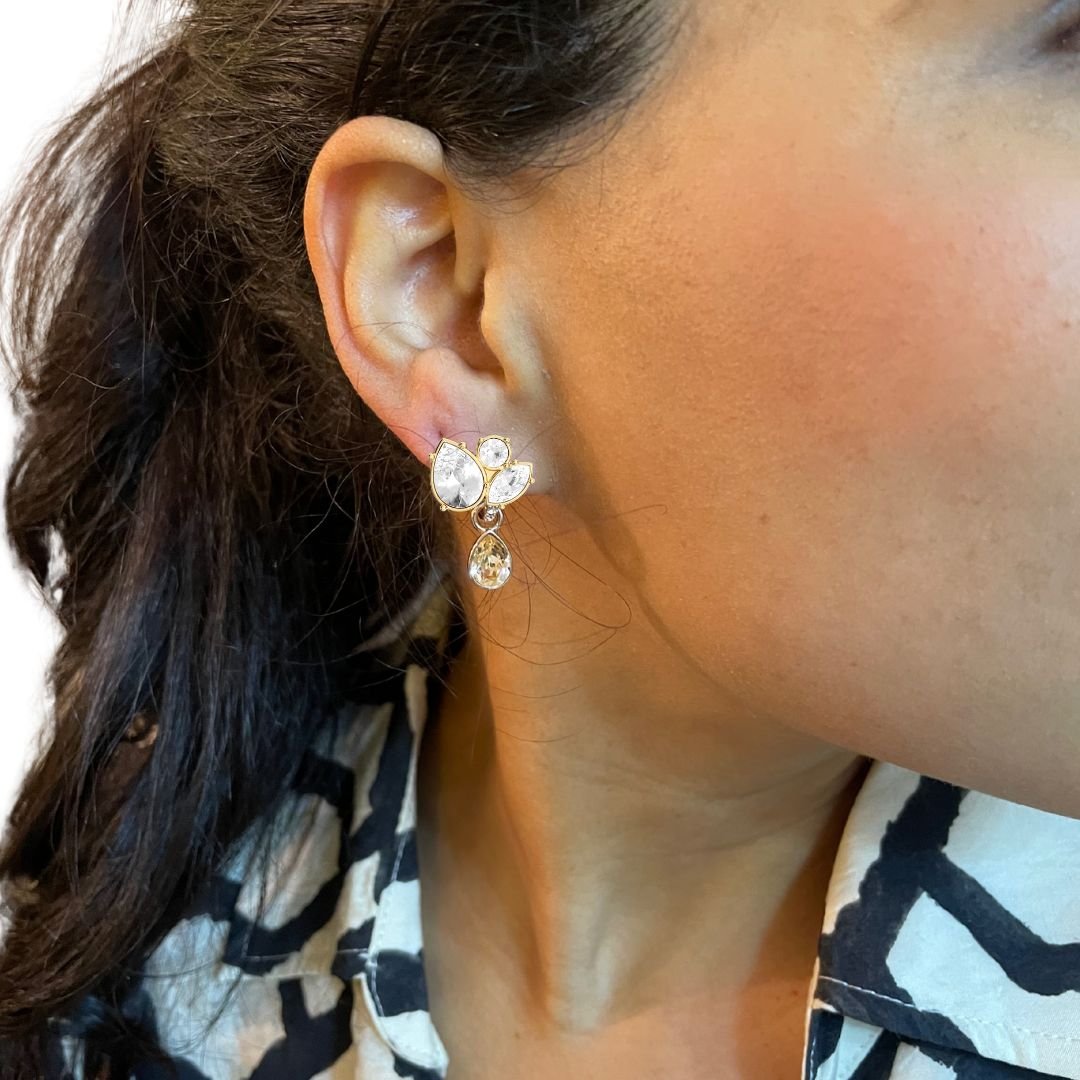 Pendientes Katia con cristal transparente y baño en oro. Elegantes, versátiles y personalizables con charms.